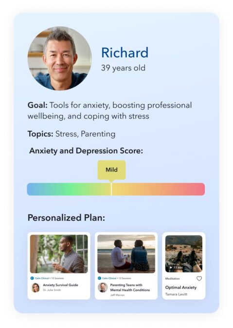 We understand that finding mental health providers with specialized expertise can be challenging. That’s why, at Calm Health, every clinical program is developed by leading psychologists with subject matter expertise. Our evidence-based programs support mental health conditions like anxiety and depression, physical and medical conditions such as diabetes and cancer, life experiences like grief, and occupational challenges faced by teachers, nurses, and more.